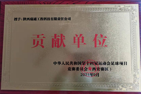 2021年9月,我公司被十四屆運(yùn)動會足球項(xiàng)目競賽委員會(西安賽區(qū))授予“貢獻(xiàn)單位”獎(jiǎng)。